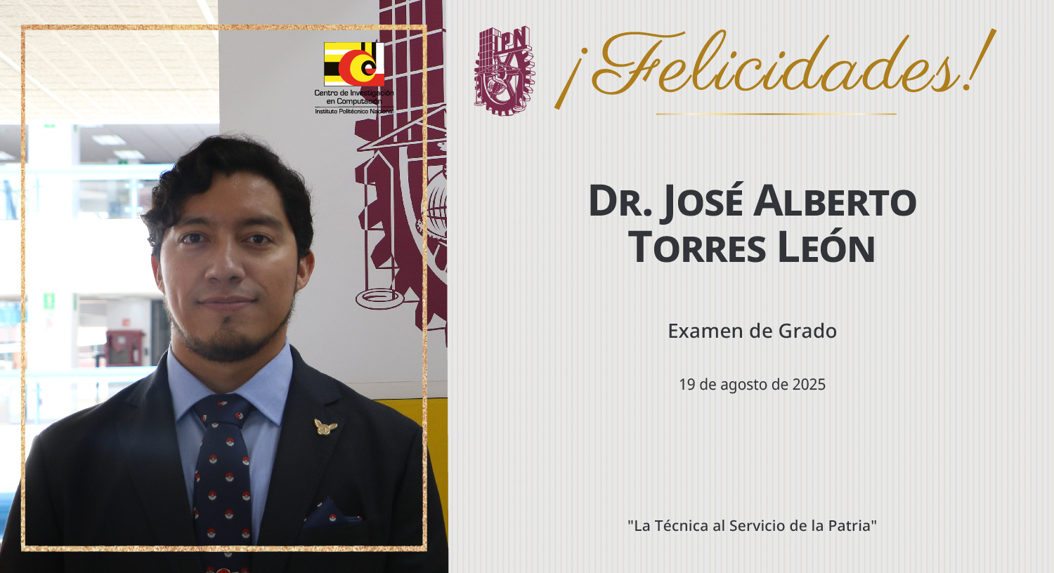 El Centro de Investigación en Computación felicita al Dr. José Alberto Torres León egresado del Doctorado en Ciencias de la Computación del laboratorio de Procesamiento Digital de Señales y Ciencias Cognitivas.