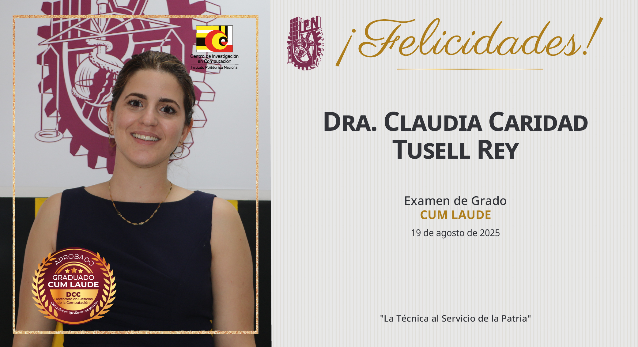 El Centro de Investigación en Computación felicita a la Dra. Claudia Caridad Tusell Rey egresada CUM LAUDE del Doctorado en Ciencias de la Computación del laboratorio de Cómputo Inteligente.