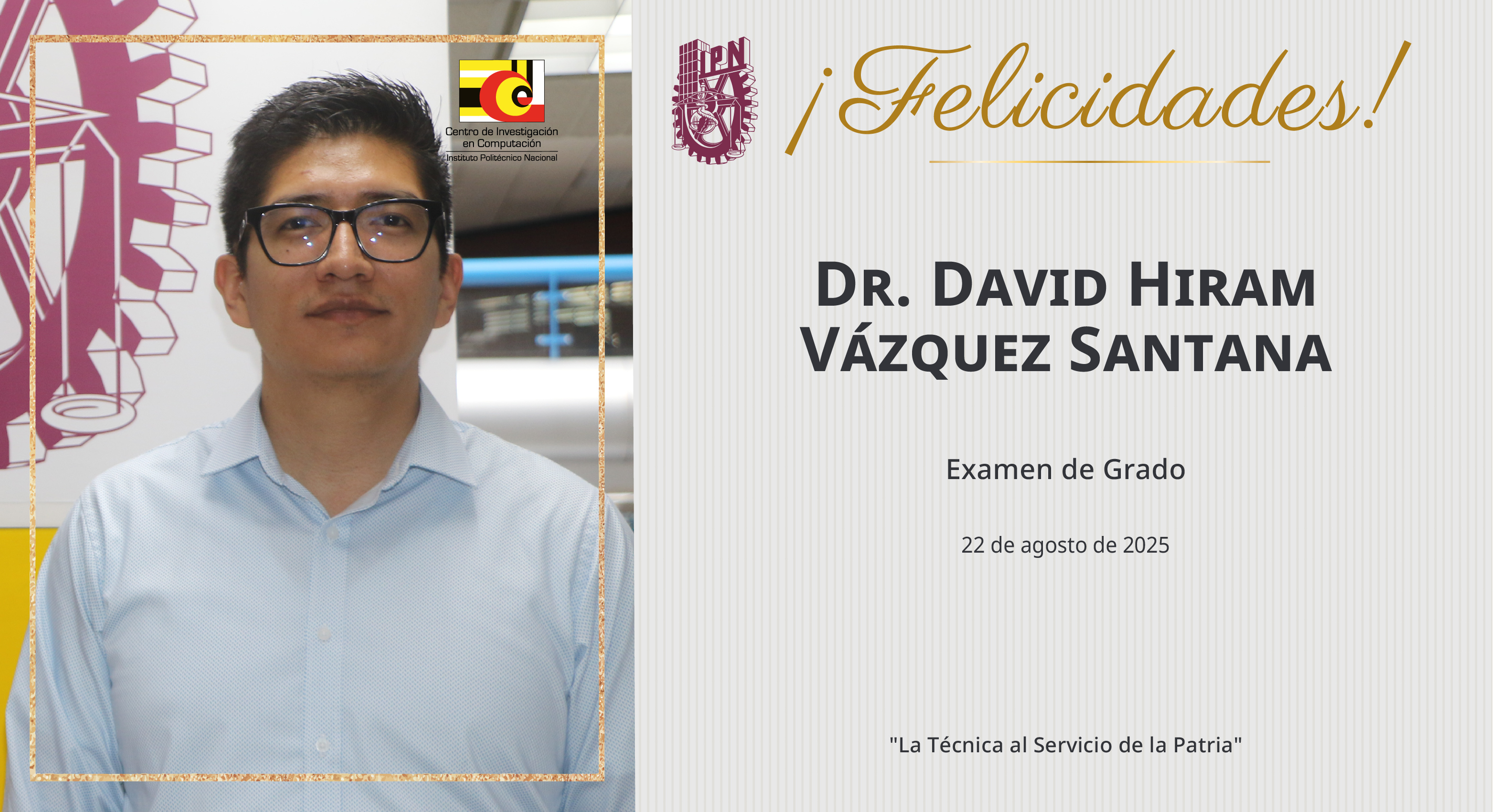 El Centro de Investigación en Computación felicita al Dr. David Hiram Vázquez Santana, egresado del Doctorado en Ciencias de la Computación del laboratorio de Cómputo Inteligente.