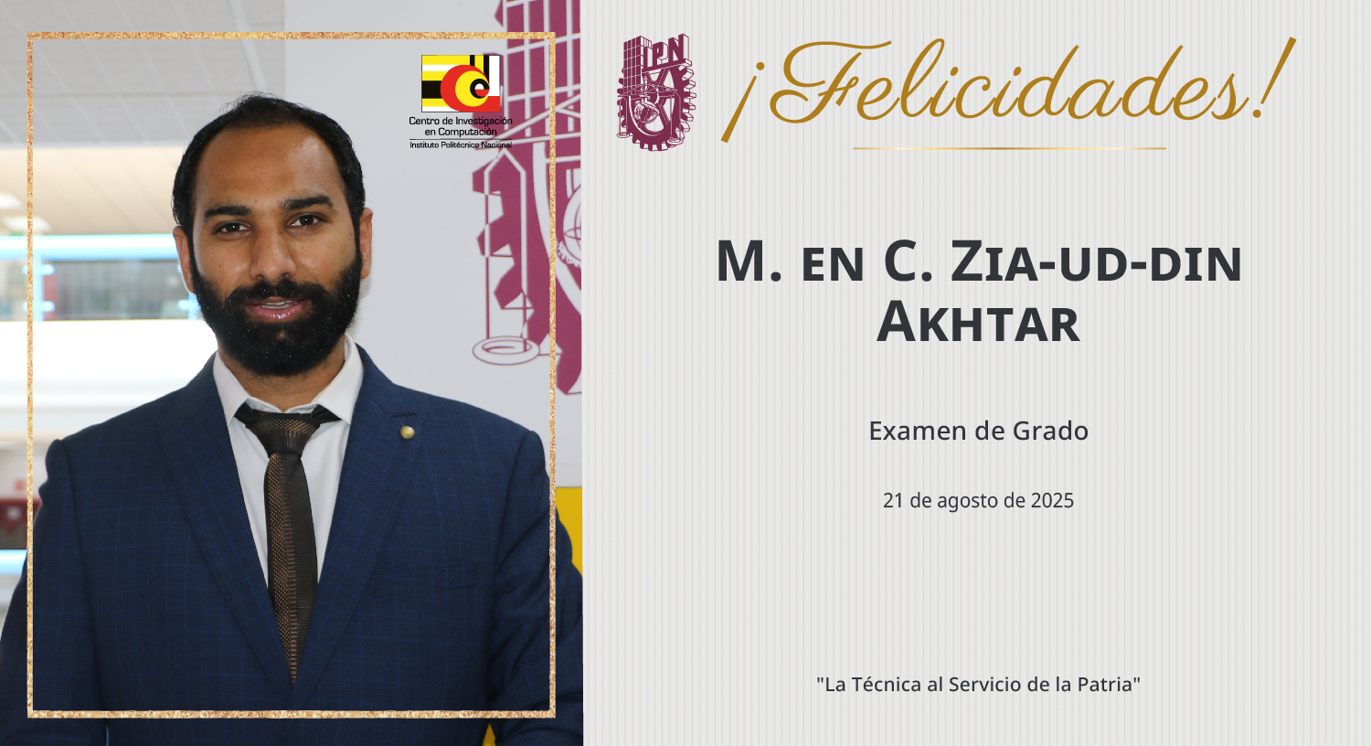 El Centro de Investigación en Computación felicita al M. en C Zia-ud-din Akhtar egresado de la Maestría en Ciencias de la Computación del laboratorio de Procesamiento de Lenguaje Natural.