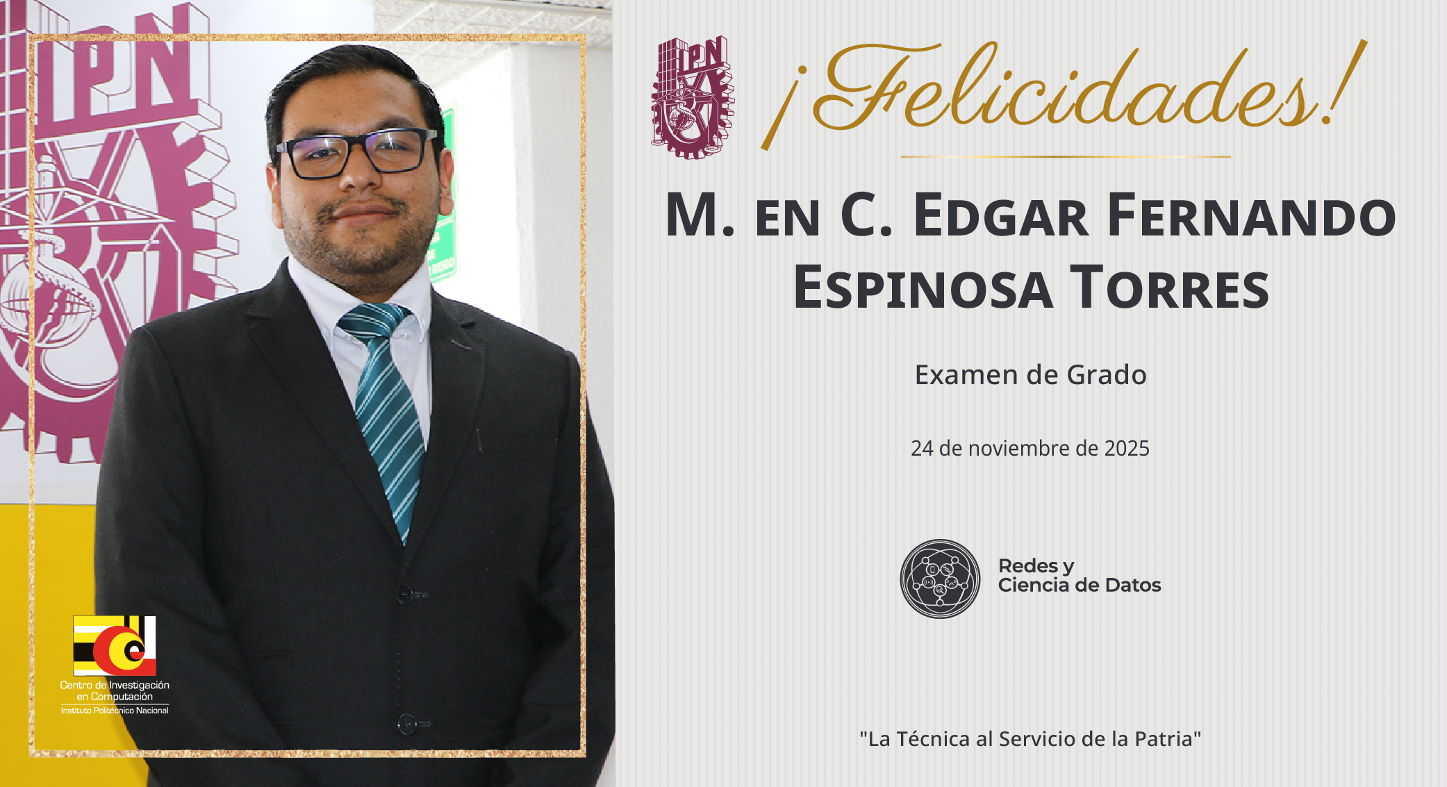 El Centro de Investigación en Computación felicita al M. en C. Edgar Fernando Espinosa Torres egresado de la Maestría en Ciencias de la Computación del laboratorio de Redes y Ciencia de Datos.